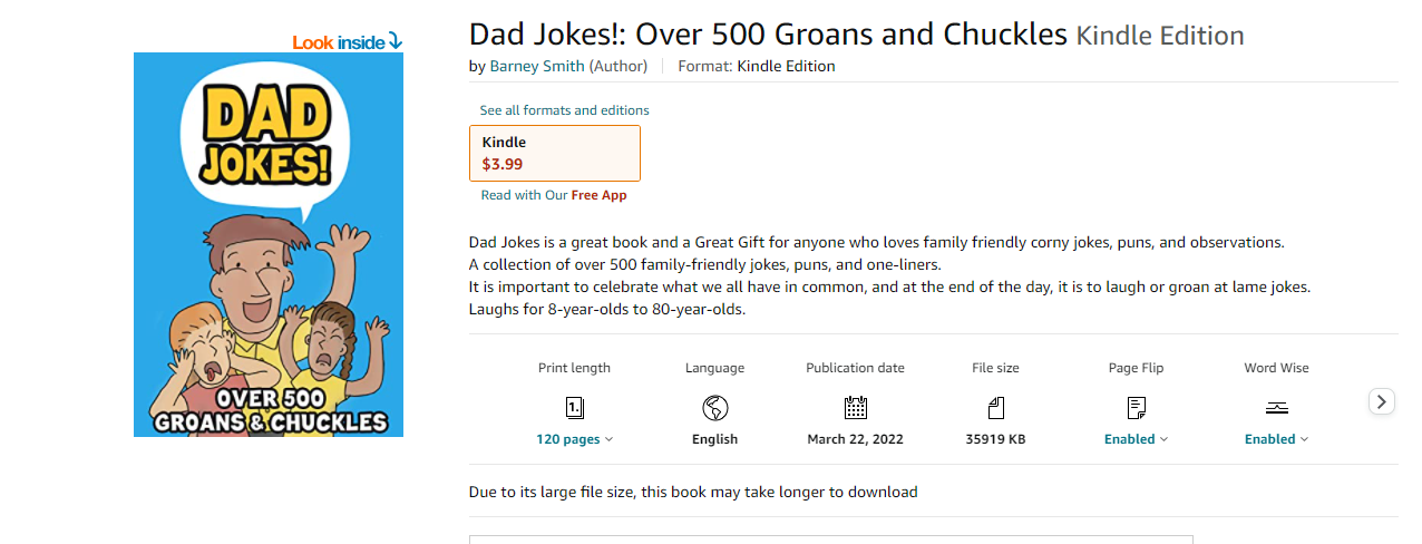 This past week I was excited to finally get my Dad Joke book published via KDP publishing. Right now it is only available via Kindle, but by next week it should have the physical copy available. I am also going to publish it via Ingram Spark so it can be available in other locations. Book stores do not carry books that are published via Amazon, that is why it is also good to get books published through Ingram Spark.