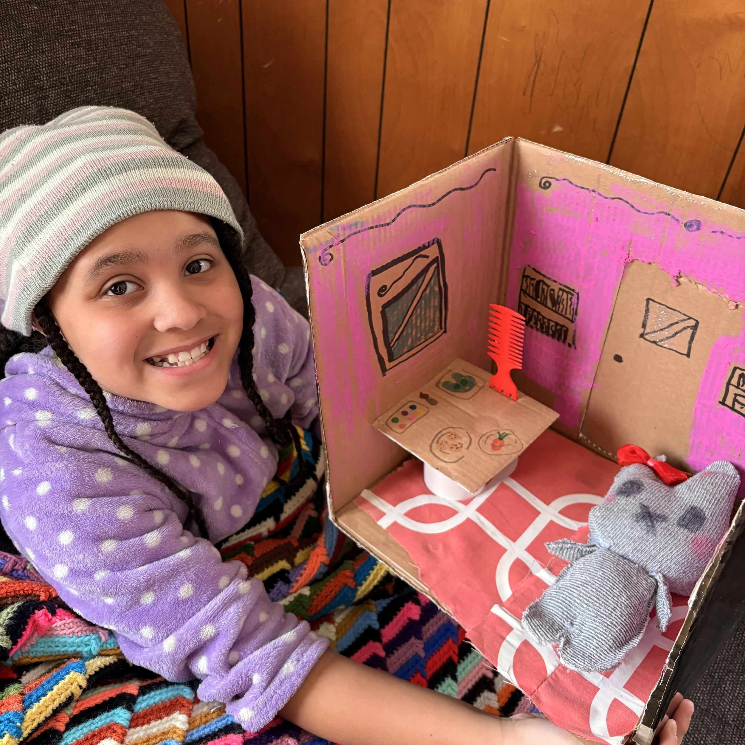 Jordan showing off her homemade bedroom for her homemade stuffy! Winter crafting keeps her busy!
